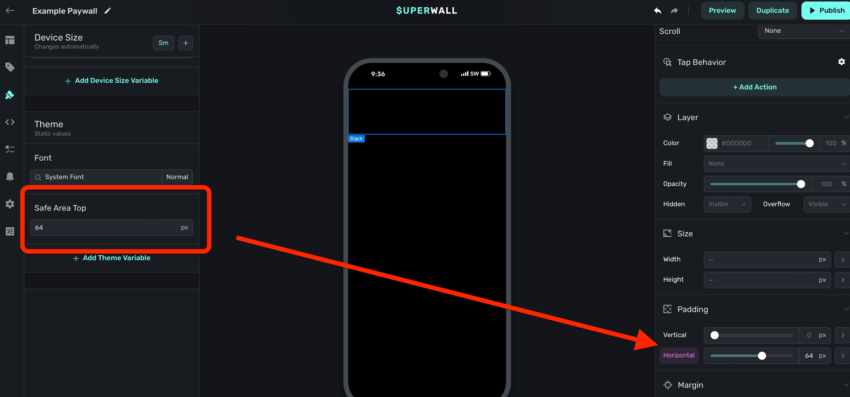 In this example, there is a variable called "Safe Area Top", set to 64 pixels. It's been set to the component's horiztonal padding for demonstration purposes: