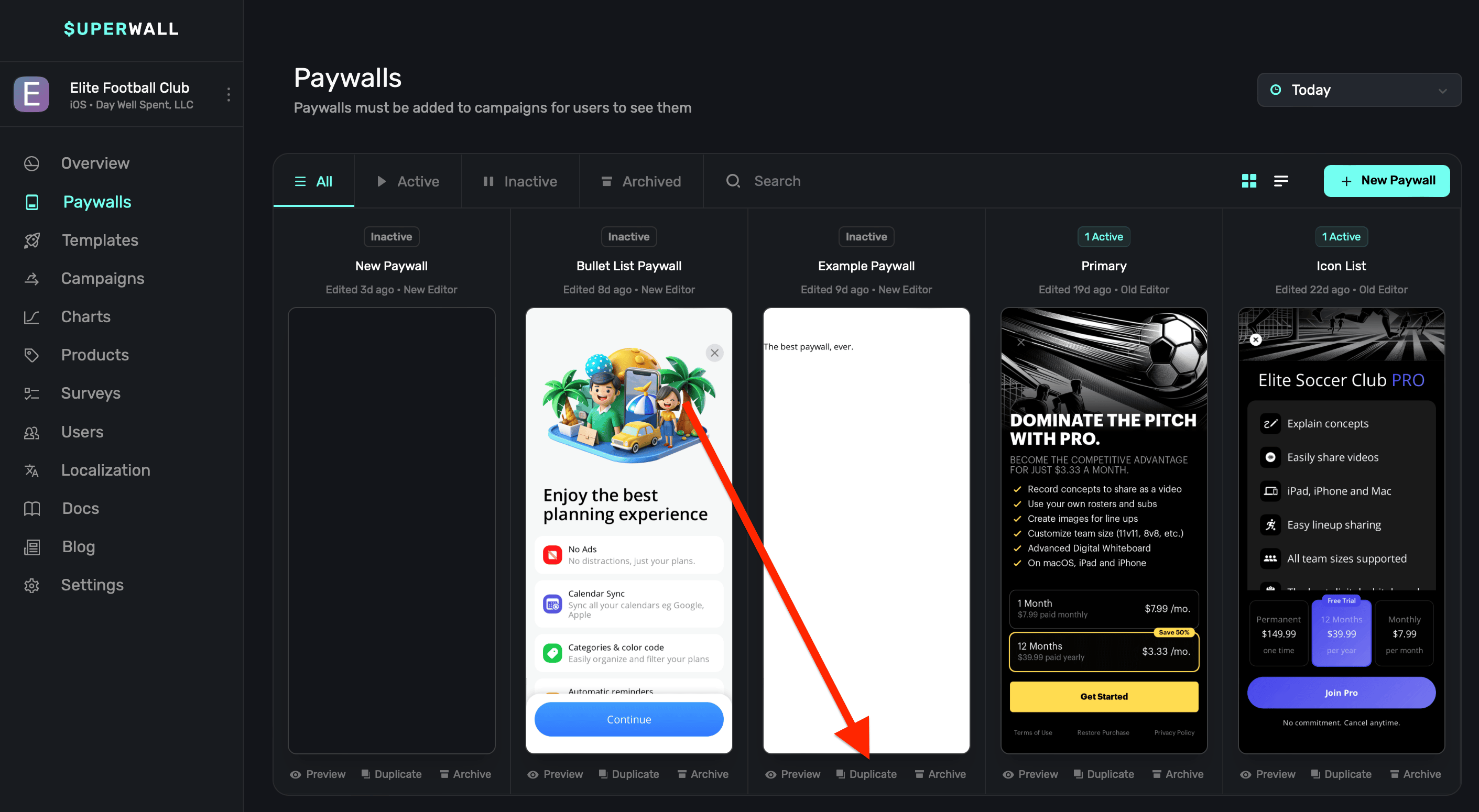 Additionally, you can duplicate a paywall by opening the Paywalls view from the left-hand sidebar for any app you have. Below any paywall to duplicate, click the Duplicate button at the bottom: