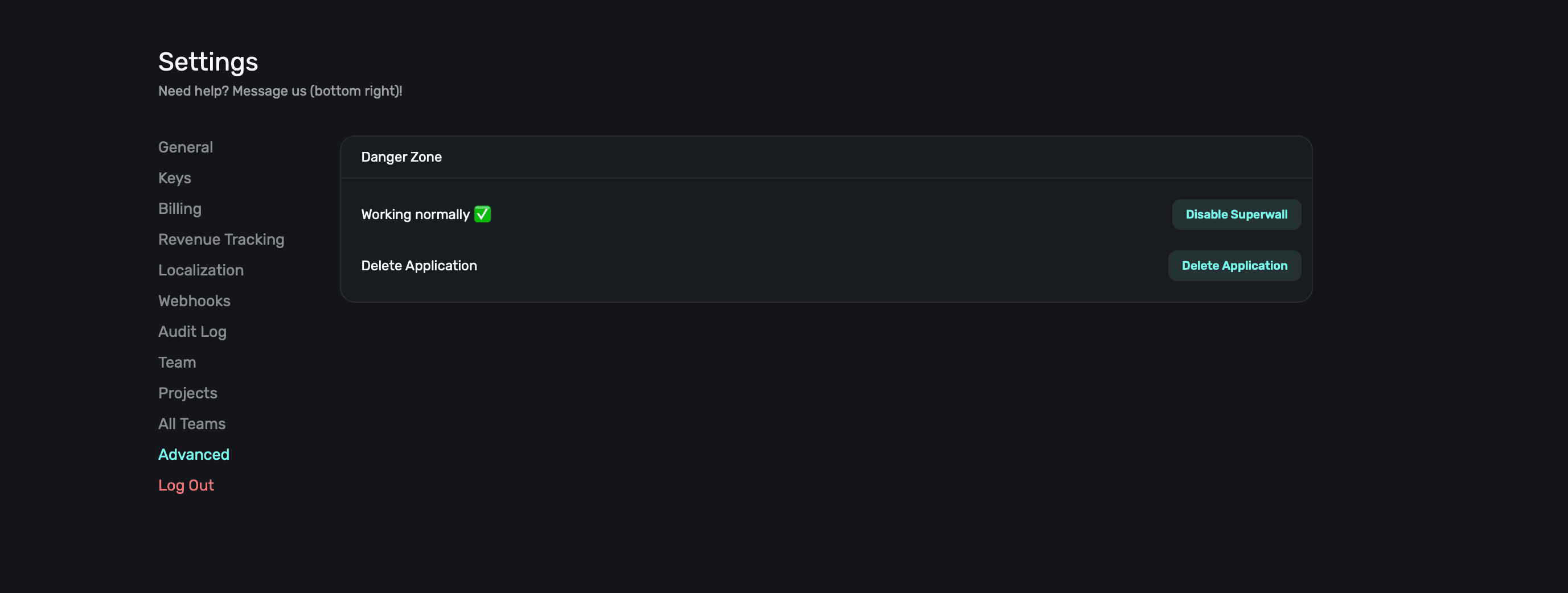 If you'd like to temporarily disable Superwall, click the Disable Superwall button. You can later resume it, but disabling Superwall stops all paywalls from being presented or placements being evaluated.