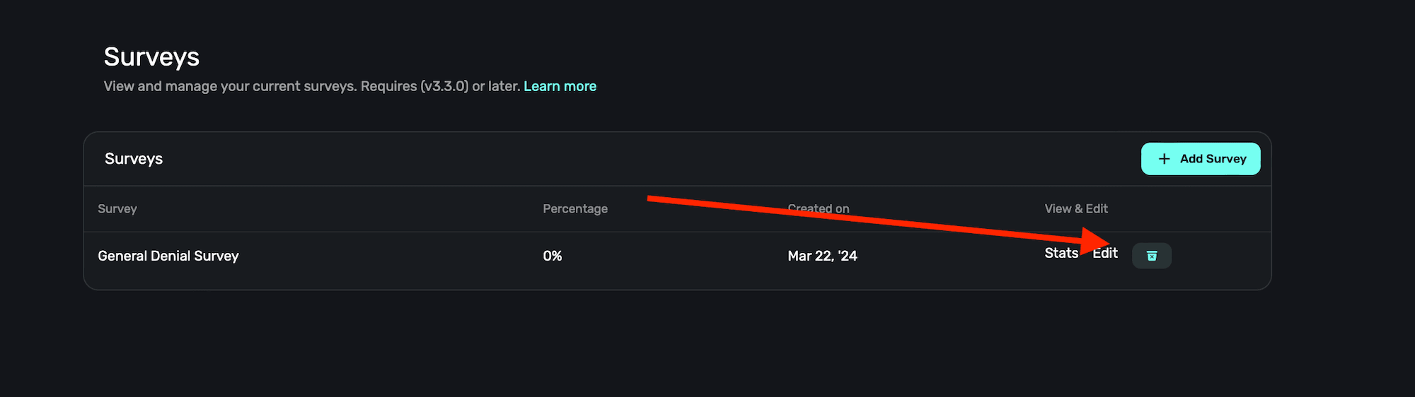 To delete a survey, click the Survey button on the sidebar. Then, for the survey you wish to delete, click the trashcan icon: