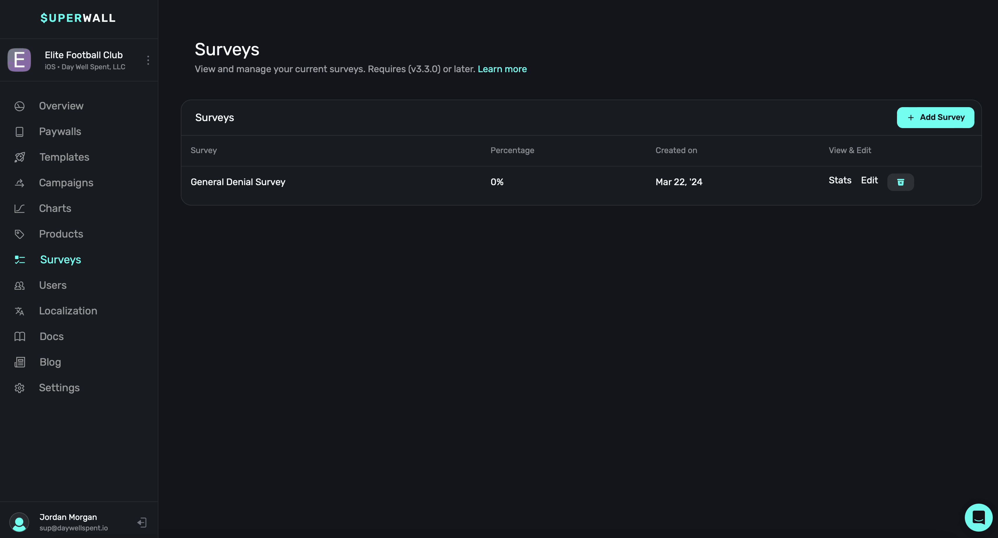 Superwall will provide sensible defaults for a new survey. If you're not quite sure what kind of questions to ask, the default options are a great place to start and will yield insightful data.