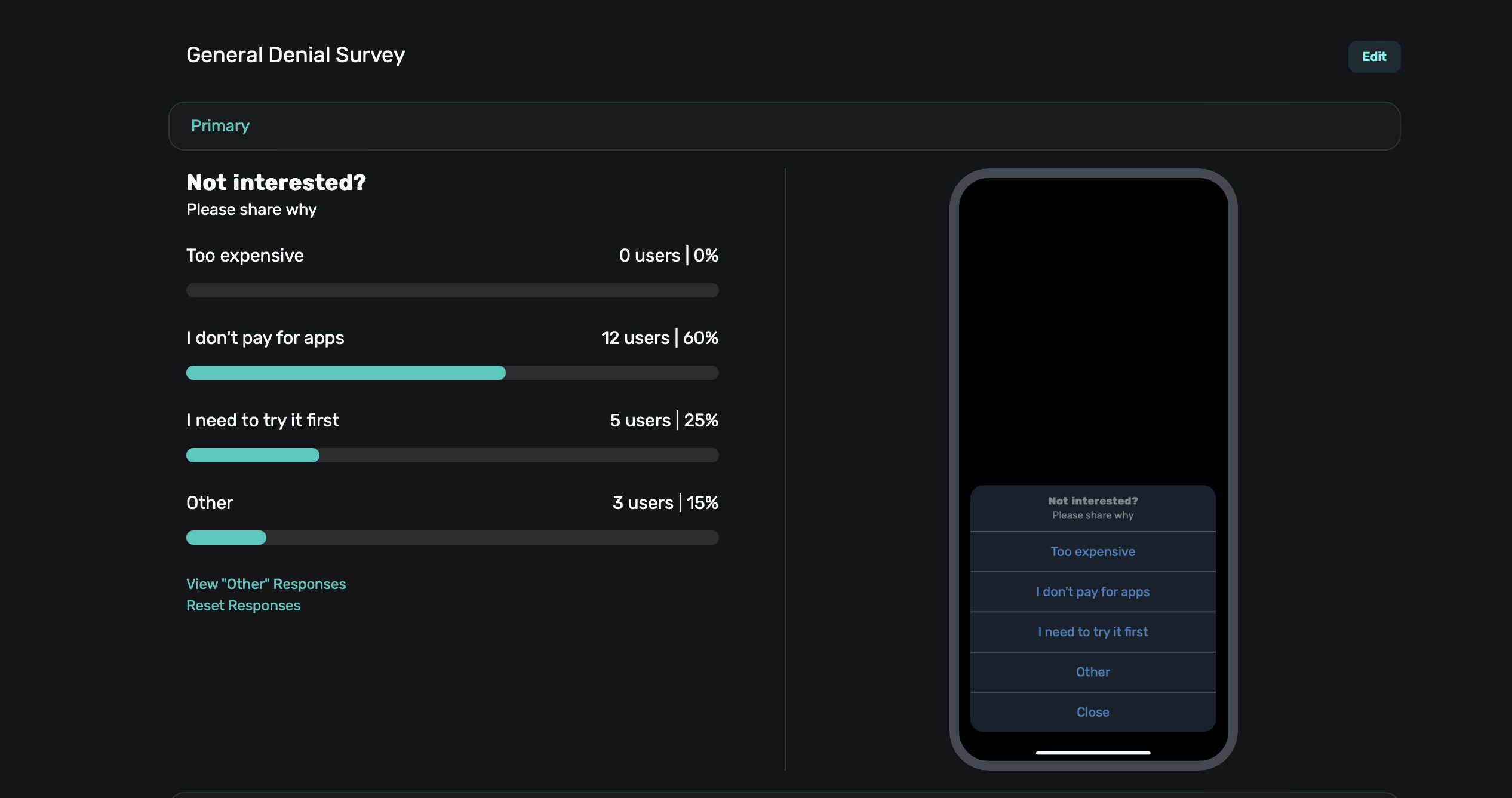 The "Other" button lets users type in a free text field. This is useful if users are willing to provide more context about why they declined (or purchased from) the paywall. If this is used, it will always display as the last option in the survey.