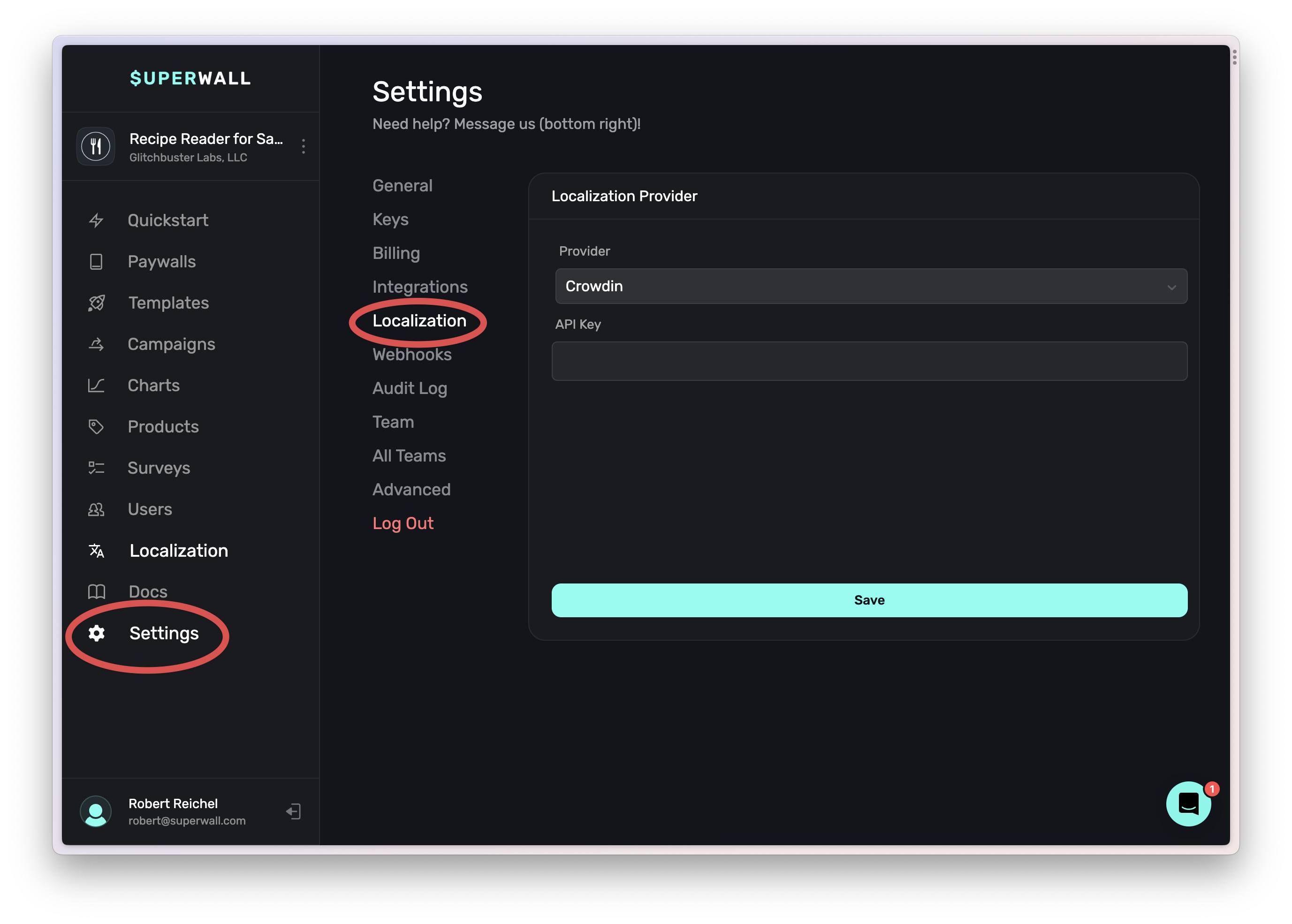 Once you've got the token, head on over to Superwall and select Settings -> Localization. Choose Crowdin from the dropdown and enter your API key.