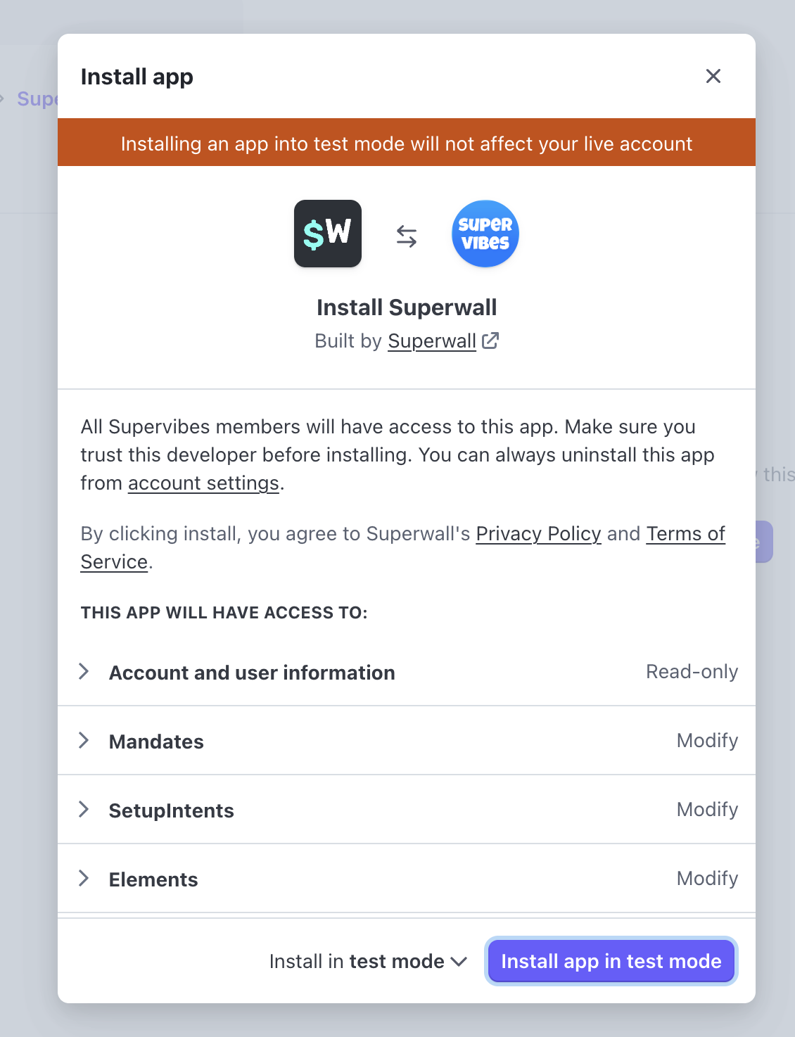 The Superwall Stripe app provides both live and test mode keys. Make sure you're in the correct mode in your Stripe dashboard when copying keys.