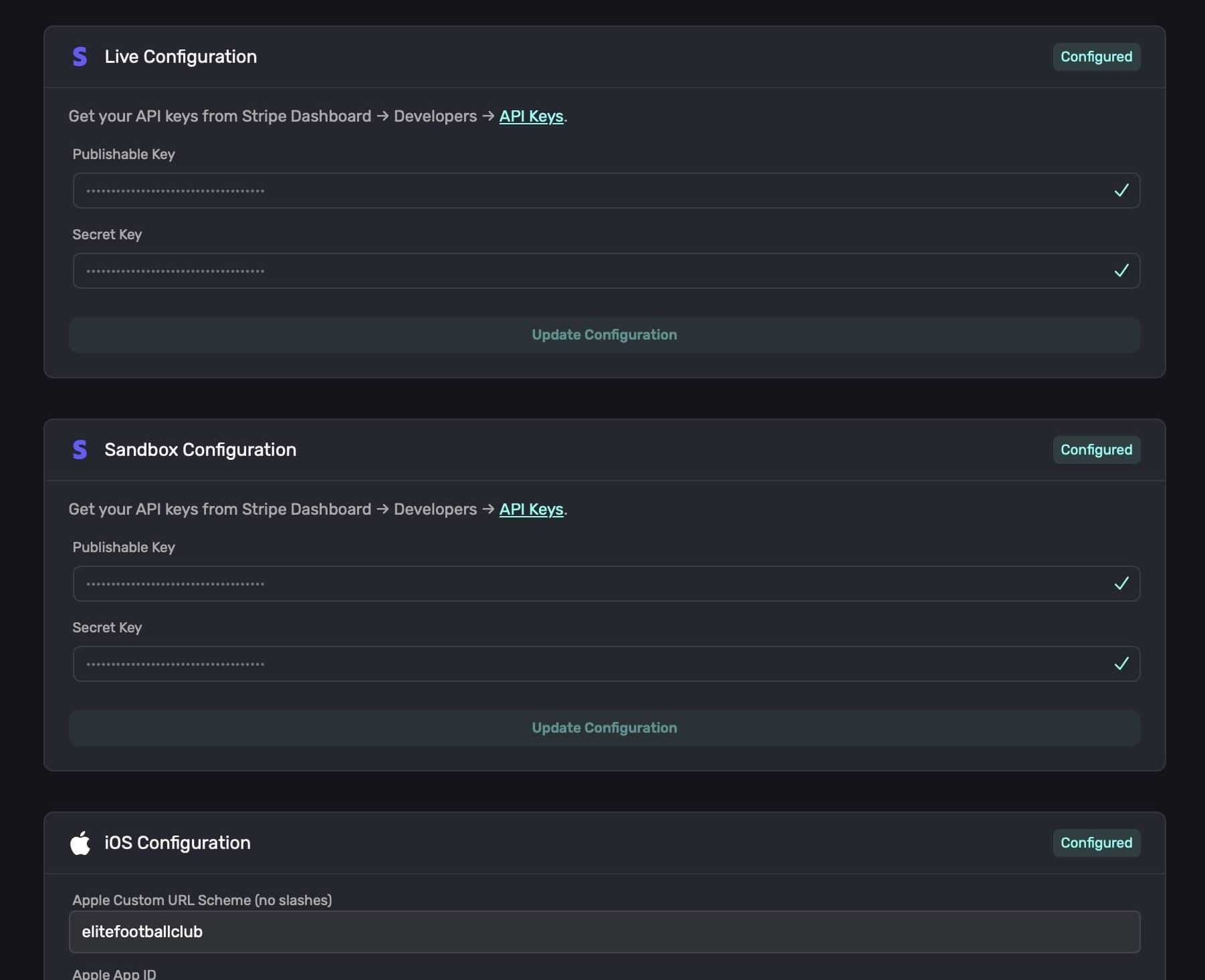Paste both keys into the Sandbox Configuration fields in Superwall, then click on the Update Configuration button.